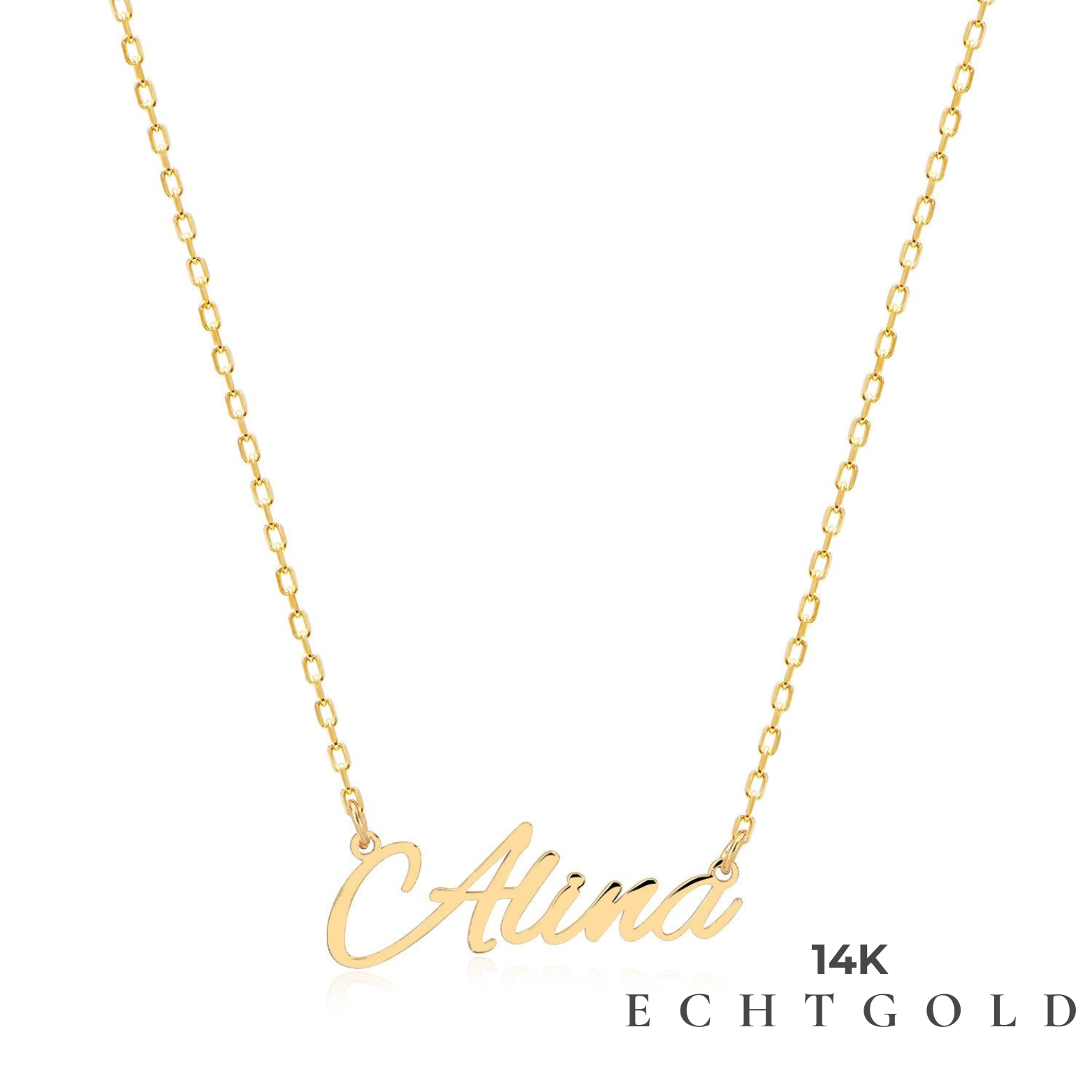 Gefertigt aus feinstem 14 K Echtgold, vereint sie luxuriöse Zurückhaltung mit persönlicher Bedeutung, dein Name, kunstvoll in fließender Schreibschrift verewigt, getragen als goldenes Statement deiner Individualität.
